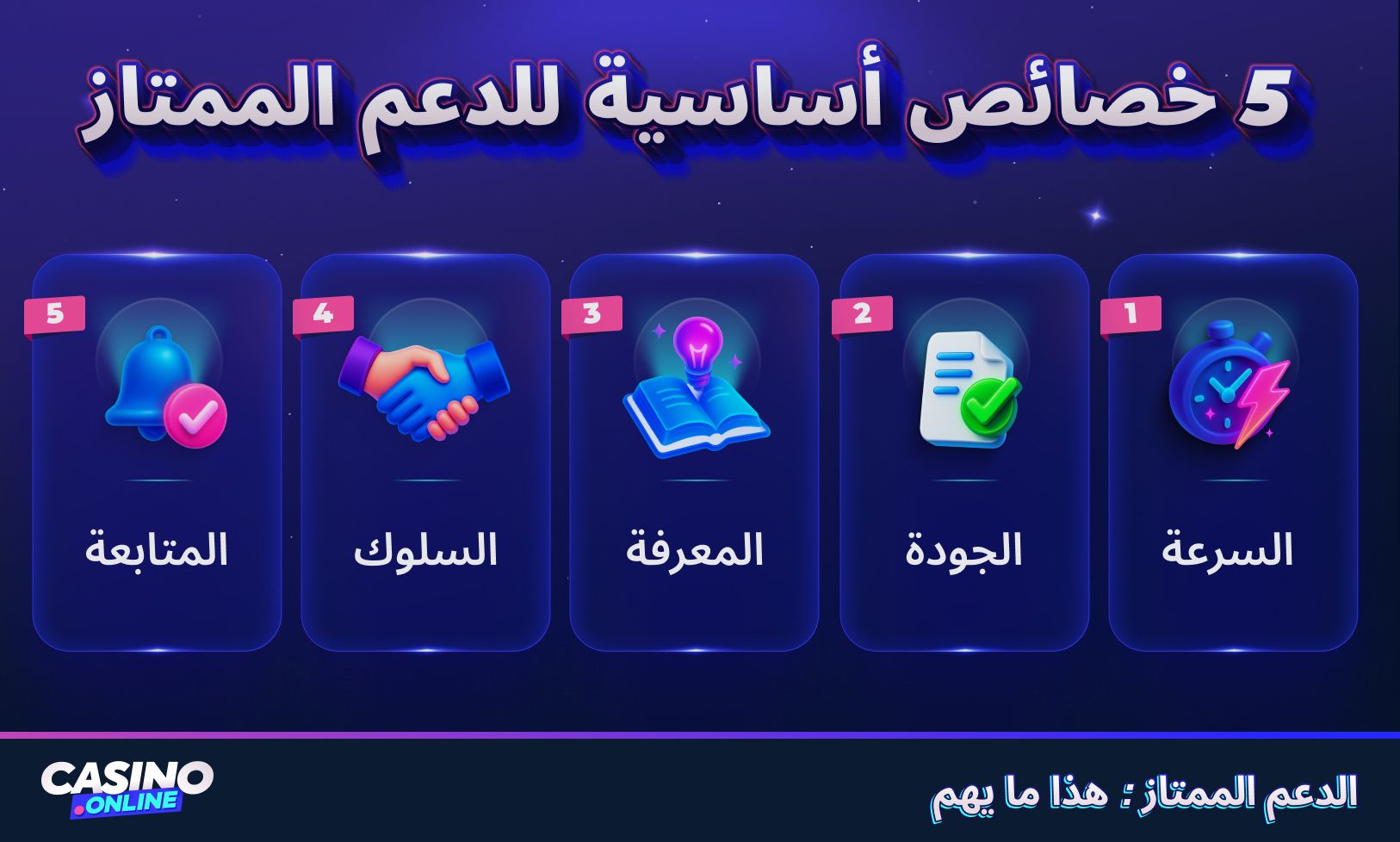 كما يُعدّ السلوك المهني عاملًا مهمًا، فالتعامل باحترام ولباقة يعزز ثقة اللاعب بالموقع. وأخيرًا تأتي المتابعة التي تُبرز التزام الكازينو بحل المشكلة بالكامل ومرافقة اللاعب حتى انتهاء الاستفسار. اختيار خدمة عملاء تمتاز بهذه الخصائص يضمن تجربة مستخدم أفضل ويعزز الثقة بالموقع.